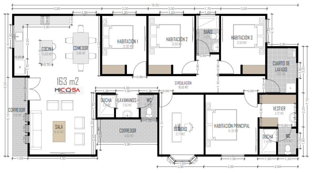 Sus áreas sociales incluyen una sala y comedor amplios, perfectos para compartir momentos especiales, además de una cocina funcional diseñada para facilitar el día a día. El estudio brinda un espacio ideal para el trabajo en casa o zona de lectura, mientras que el vestier aporta comodidad y orden. Los corredores conectan los espacios de manera armoniosa, generando una sensación de amplitud y fluidez en toda la vivienda.